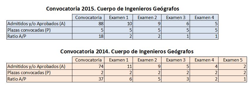 Ingenieros Geógrafos, en la convocatoria de 2014 el ratio fue de 37 y en la convocatoria de 2015 de 18.
